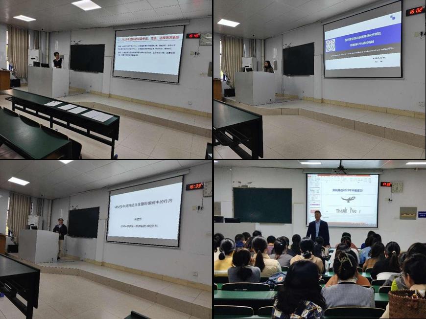 会议首先以两个学术报告开场,生理学教研室刘珊博士作了“淫羊藿苷抗动脉粥样硬化作用及非编码RNA调控机制”学术讲座。第一附属医院神经外科余建东博士作了“抑制性中间神经元在颞叶癫痫中的作用”学术讲座,并结合自己的经验,与在座师生分享了国家自然科学基金项目申请书的撰写心得体会和注意事项。两位博士的讲座引起了在座师生的强烈共鸣,大家积极互动交流,深入积极探讨问题,学术氛围浓厚,气氛热烈。