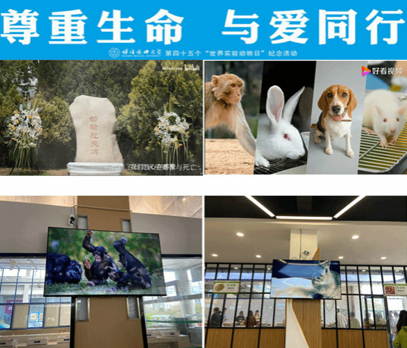 活动前一天,在员工食堂等多处以大屏、电视等方式轮流播放实验动物相关视频,向同学们普及“世界实验动物日”相关知识。落其实者思其树,饮其流者怀其源,生命科学的发展和进步离不开实验动物,这些小精灵值得人类送上崇高的敬意与深深的悼念!
